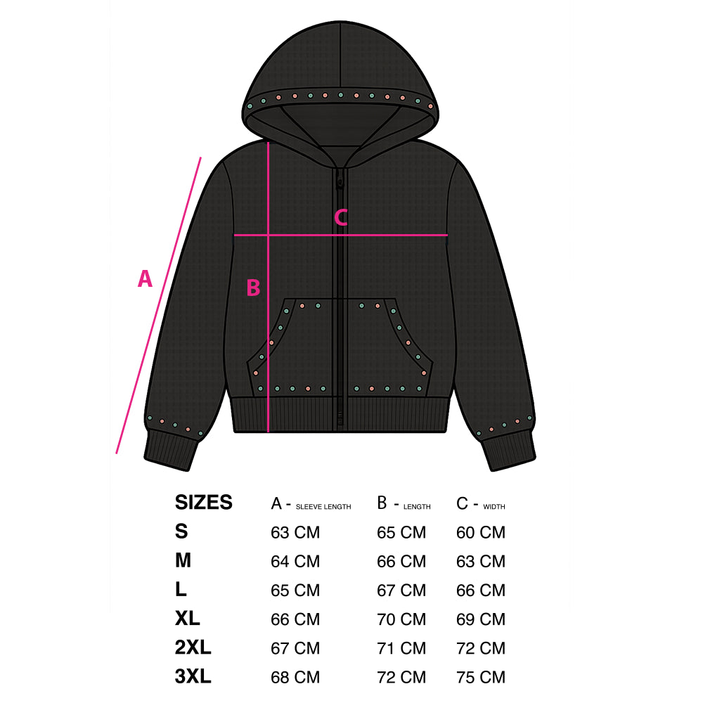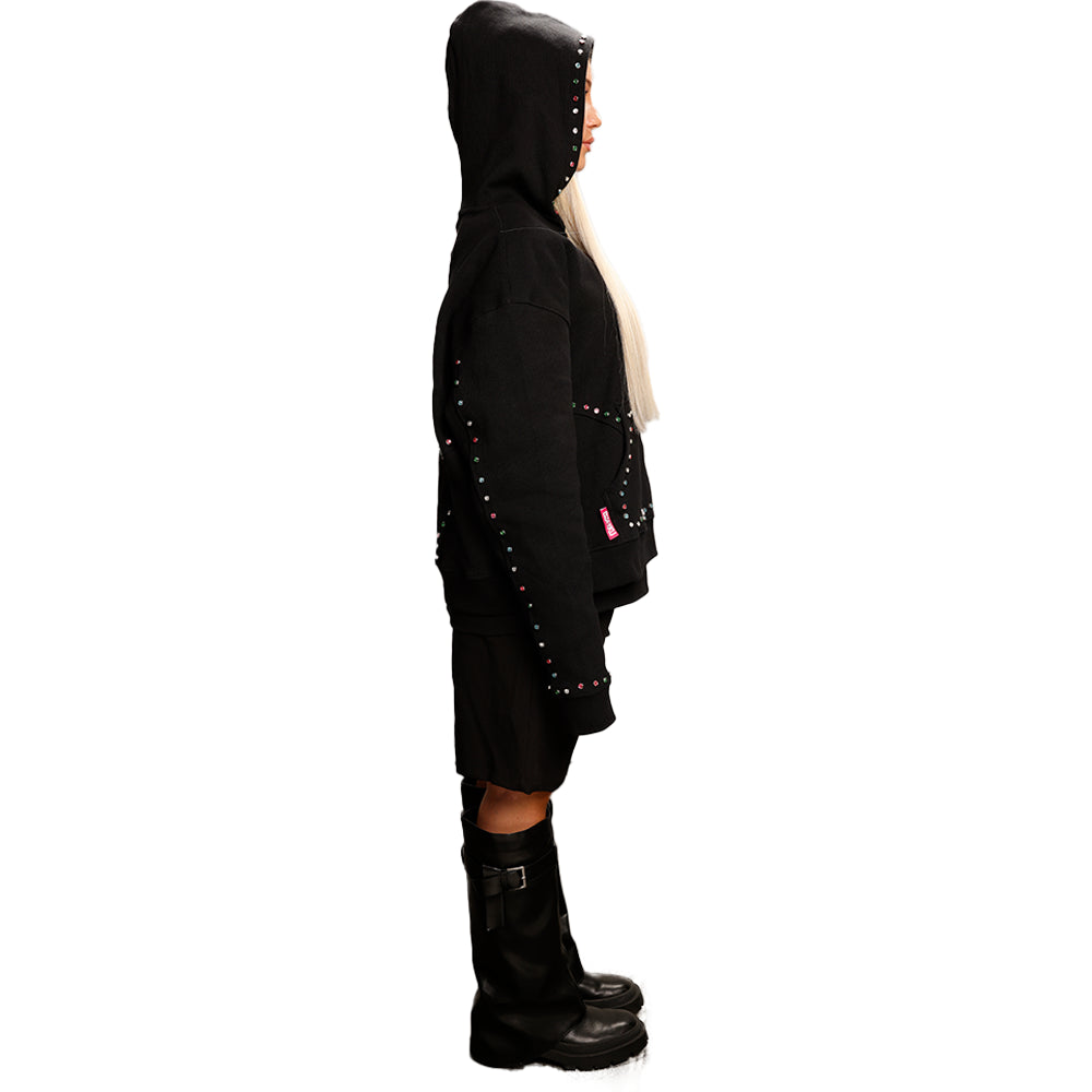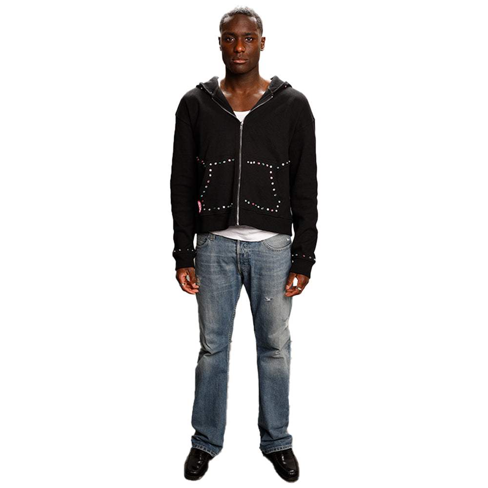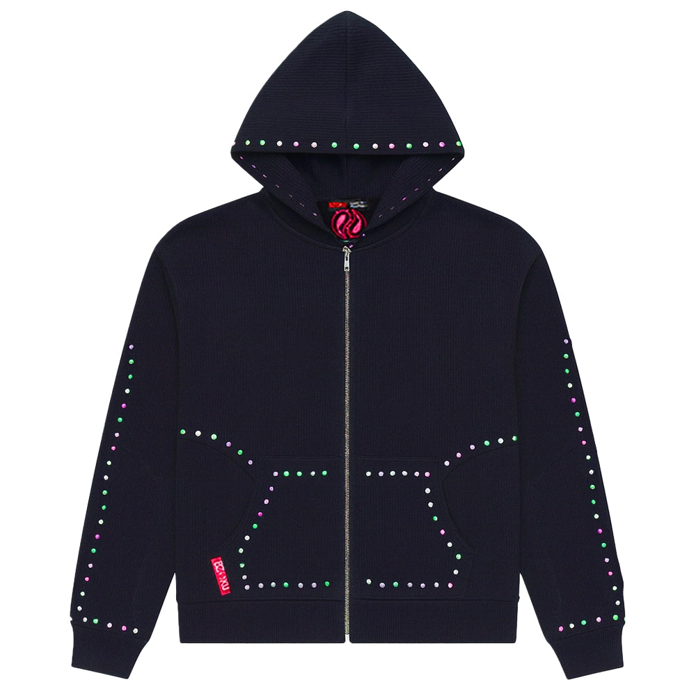 The Stardust Waffle Cotton Jacket, crafted from 100% waffle cotton, features 226 individually handpunched rivets in the colors blue, green, white and pink. Decorative stitching along the sleeves enhances the crafted look. The silhouette comes in a cropped, boxy fit for a bold statement.