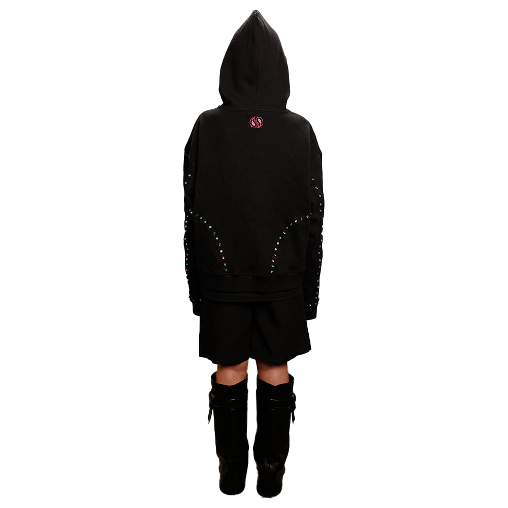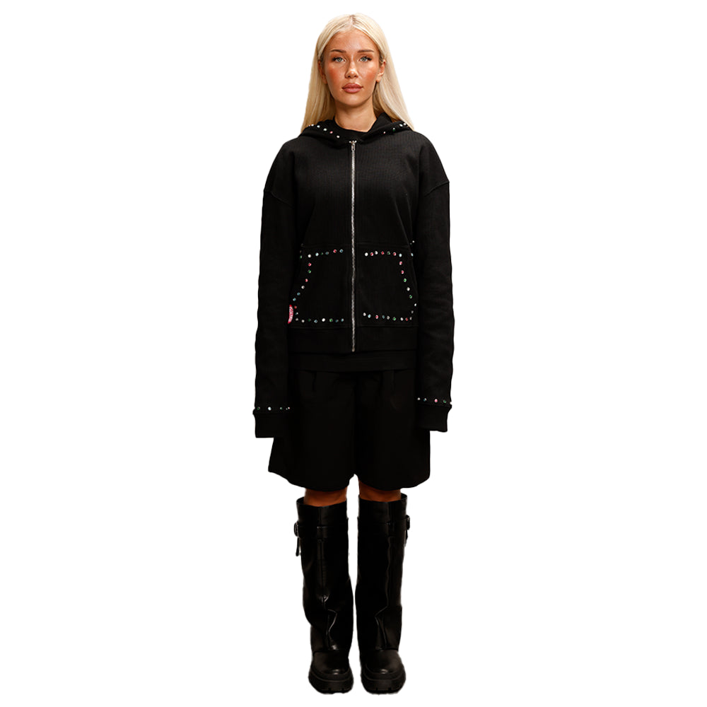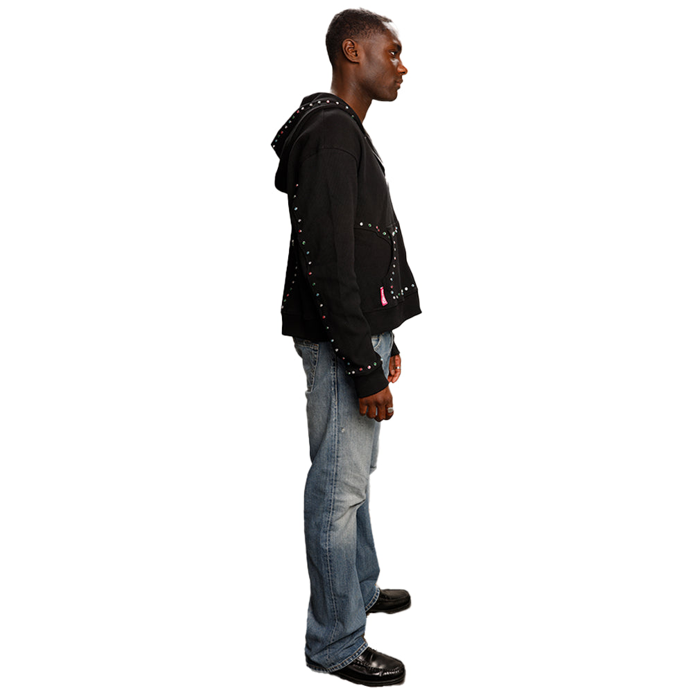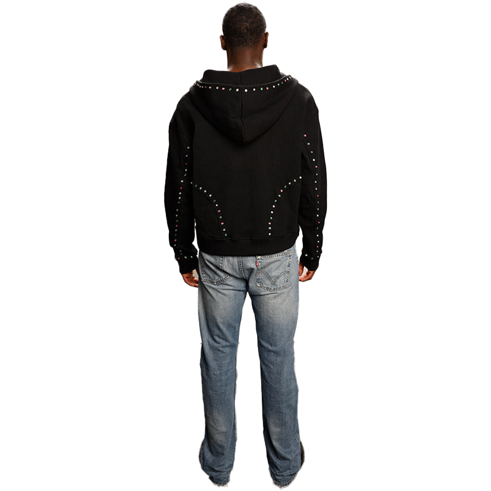 The Stardust Waffle Cotton Jacket, crafted from 100% waffle cotton, features 226 individually handpunched rivets in the colors blue, green, white and pink. Decorative stitching along the sleeves enhances the crafted look. The silhouette comes in a cropped, boxy fit for a bold statement.